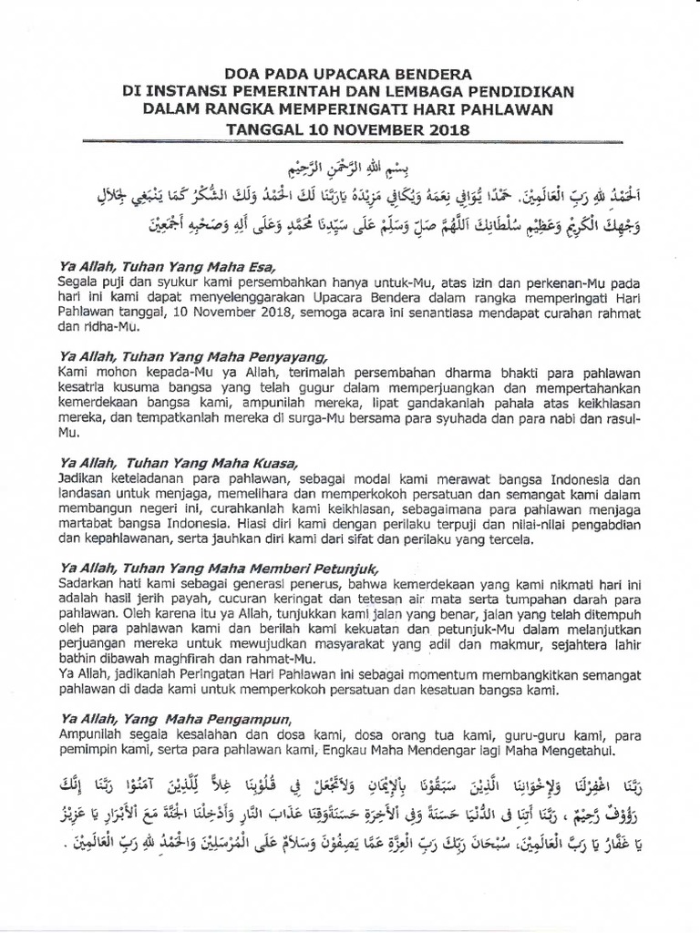 Melansir dari scribd berikut ini doa Hari Pahlawan yang bisa dijadikan contoh. Ya Allah Tuhan Penguasa Alam Kami merafakkan rasa kesyukuran kepadaMu kerana telah mengizinkan kami untuk berada dan menghadiri KarnivaL Bahasa inggeris peringkat negeri Sabah 2012 pada hari ini. Doa HUT Kemerdekaan RI yang Menyentuh Qalbu.