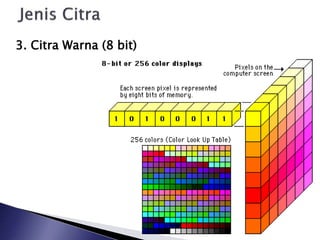 Warna bagi setiap piksel pixel ditentukan oleh pola bit yang terdiri daripada 0 dan 1. UNIT UKURAN BAGI IMEJ DIGITAL 1. Pixel yang mampu menampilkan 3 bit berarti 2 x 2 x 2 8 warna 4 bit berarti 2 x 2 x 2 x 2 24 16 warna dan seterusnyaJadi dapat disimpulkan bahwa bit depth adalah kemampuan pixel dalam menyimpan bit atau informasi dalam hal ini akan berpengaruh terhadap banyaknya warna yang dapat ditampilkan oleh monitor kita.